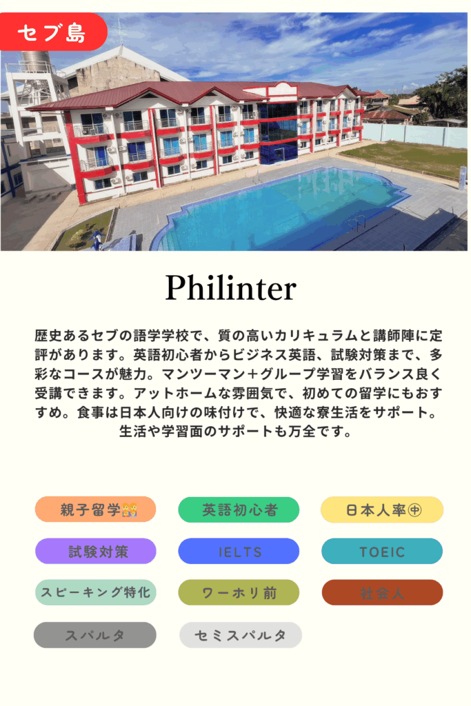 参考費用: 4週間 = $1600~(寮・食事込)